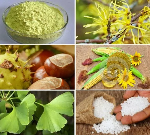 Horse-chestnut at dahon ng witch-hazel (pinapalakas ang mga pader ng daluyan ng dugo) ;